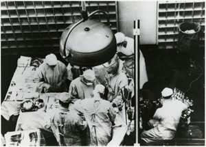A surgical team at the Peter Bent Brigham Hospital in Boston, led by Dr. Joseph Murray, performs the first kidney transplant in 1954. Brigham and Women's Hospital Archives